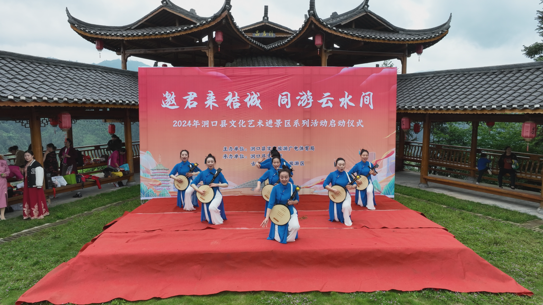新洞口客户端5月1日讯(记者:刘力渔 薛源)5月1日,洞口县在古楼驿生态文化旅游区开展“邀君来桔城 同游云水间”为主题的文化艺术进景区志愿服务活动,为游客们献上视觉盛宴。