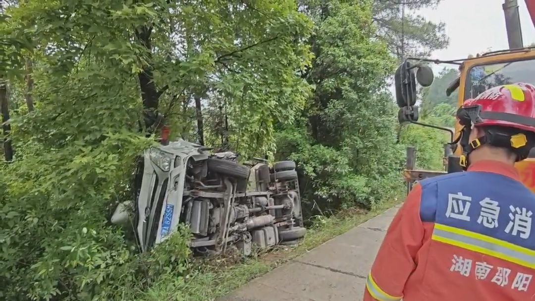 新洞口客户端5月13日讯( 记者:刘力渔 通讯员:周丽霞)5月12日07时56分,在石江镇庆节村某上坡路段一辆货车发生侧翻,驾驶员被困。接到报警后,县消防救援大队指挥中心第一时间出动雪峰消防救援站2车14人前往现场紧急救援。