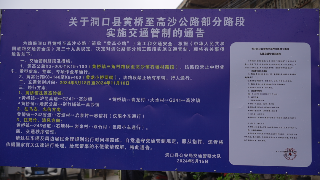 据了解,黄桥至高沙公路改建工程2024年5月18日至2024年11月18日黄高公路K3+000至K15+100(黄桥镇三角村路段至高沙镇石堰村路段)进行交通管制,该路段禁止中型货车、重型货车、挂车、专项作业车通行;对黄高公路K8+140至K8+400(黄龙小桥两端)进行封闭式施工,该路段禁止所有车辆、行人通行。