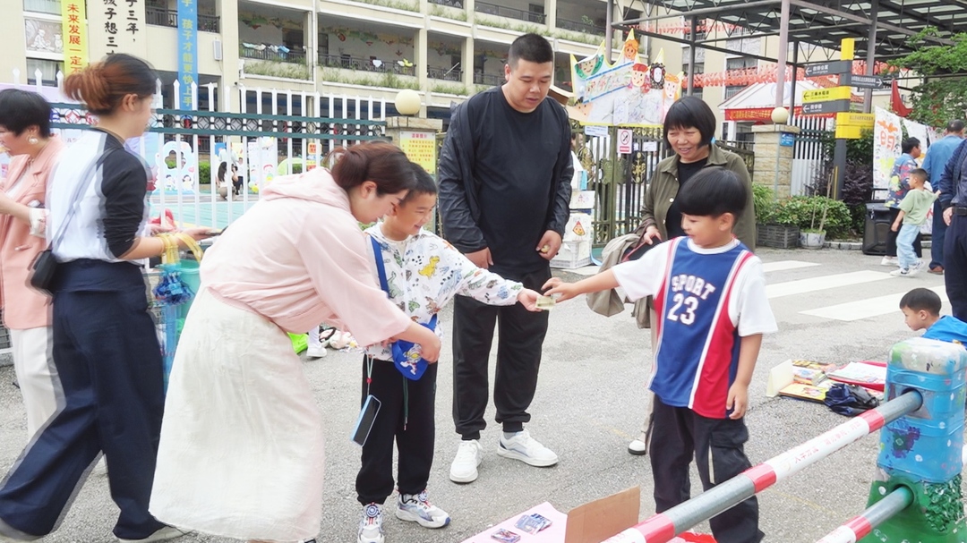 在“跳蚤市场”,买卖活动遵循“货物真实,开心购物”原则,由孩子自行决定,最大程度发挥幼儿的主动性。孩子们扮演起“老板”角色,热情地向往来小顾客推销自己的商品;也有孩子带着家长准备的零钱,在各摊位间认真地挑选自己心仪的商品,体验着公平买卖的过程。