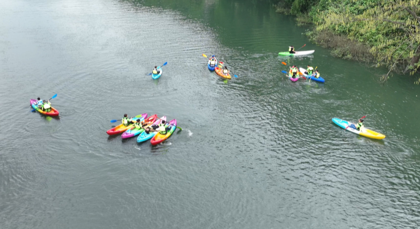 游客们身穿救生衣,头戴安全帽,分坐于漂流艇两头,在安全员的引导下开启皮划艇漂流之旅。皮划艇一入水,游客们便兴奋地打起了水仗,感受嬉水的清凉。一只只皮划艇在时而湍急、时而平缓的水流中顺流而下,飞溅起的小浪花让游客在惊险刺激中感受到夏日的愉悦。