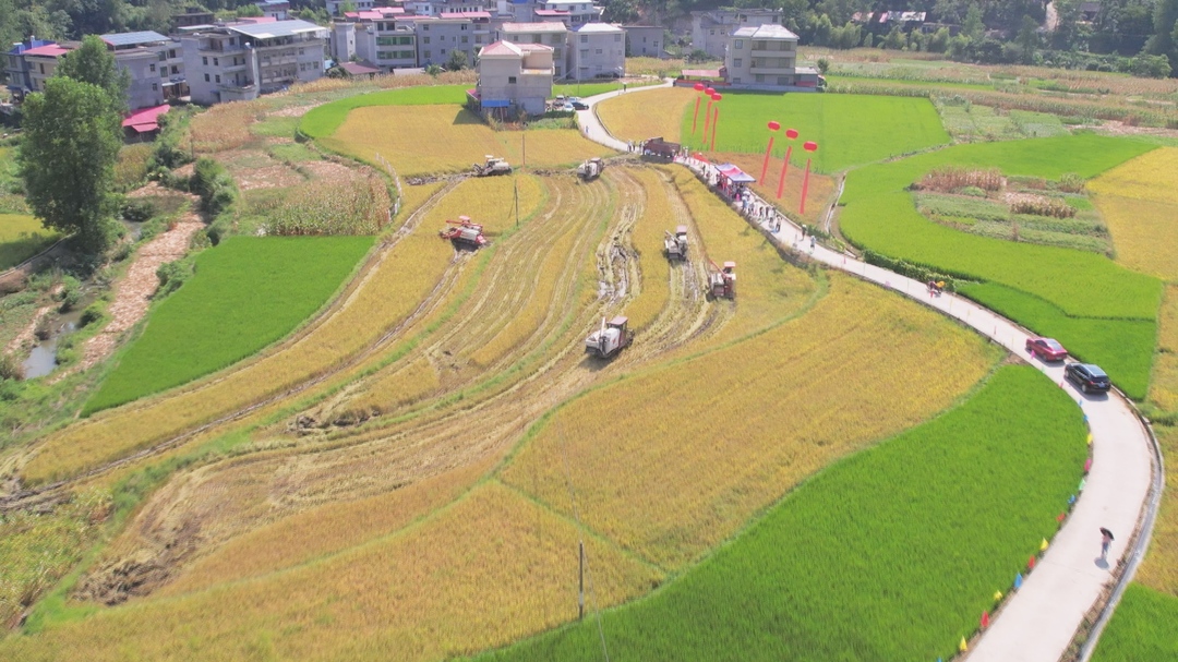 演示现场,6台水稻联合收割机一字排开,农机操作手熟练地在驾驶舱调试,操作着水稻联合收割机在稻田间来回穿梭,稻香弥漫,轰鸣声四起,机器后的秸秆碎屑飘扬,留下一排排整齐的稻茬,稻谷收割干净。现场展示的高效机收作业流程,让在场村民直观感受到农业机械化带来的便利。