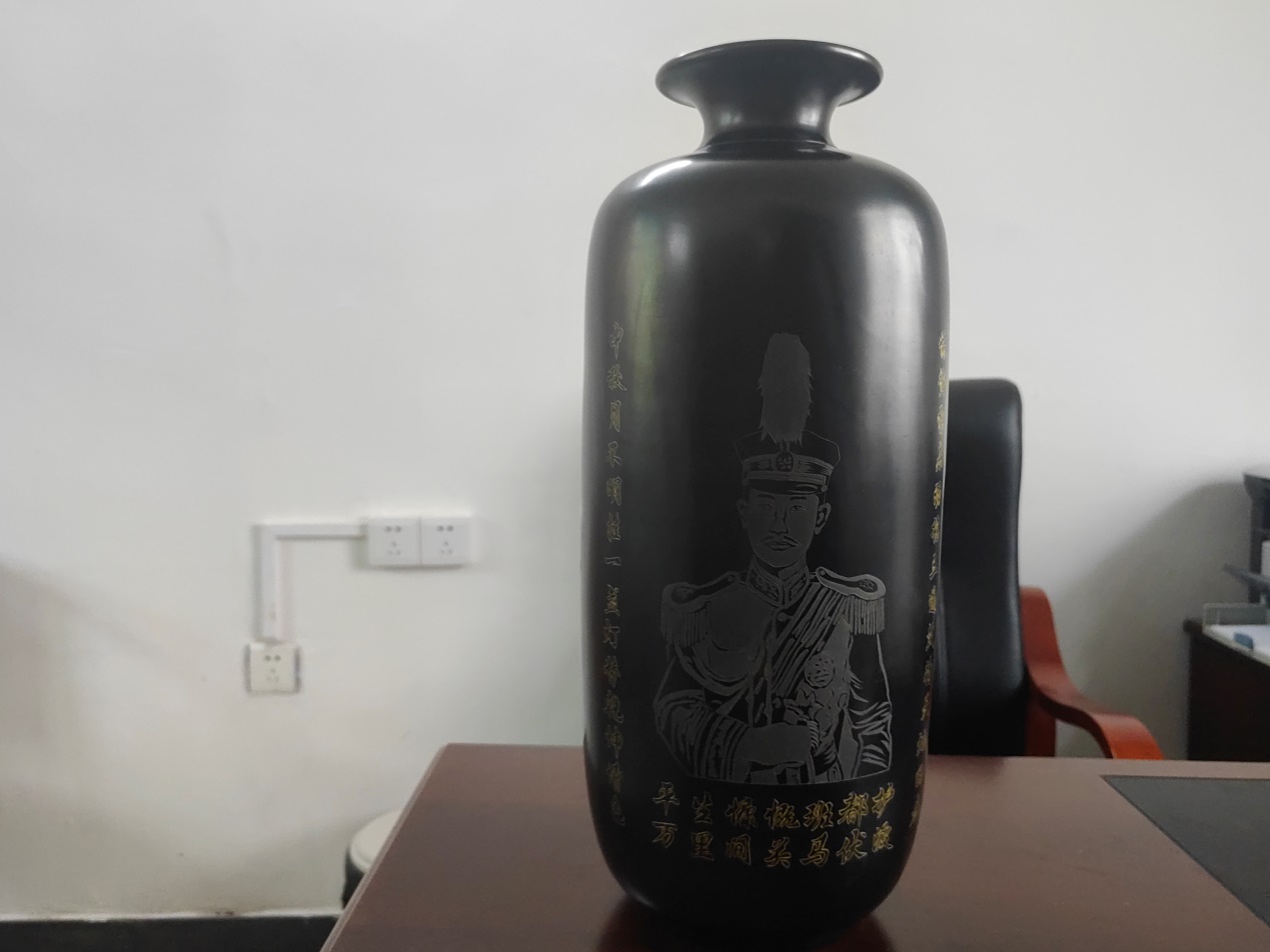黑陶瓶是山东省级非物质文化遗产,黑陶陶土选取十分考究,选用的黏土是在地下积淀千年而来,质性细腻,土体柔软,制作工艺代代相传,在潜心研究古代制陶工艺的基础上,融合现代工艺美术,精致美观,胎薄而质地坚硬,制作工艺之精细堪称一绝。黑陶瓶正面绘制蔡锷将军像,下刻孙中山先生挽联:平生慷慨班都护,万里间关马伏波,概括了蔡锷将军的传奇人生。