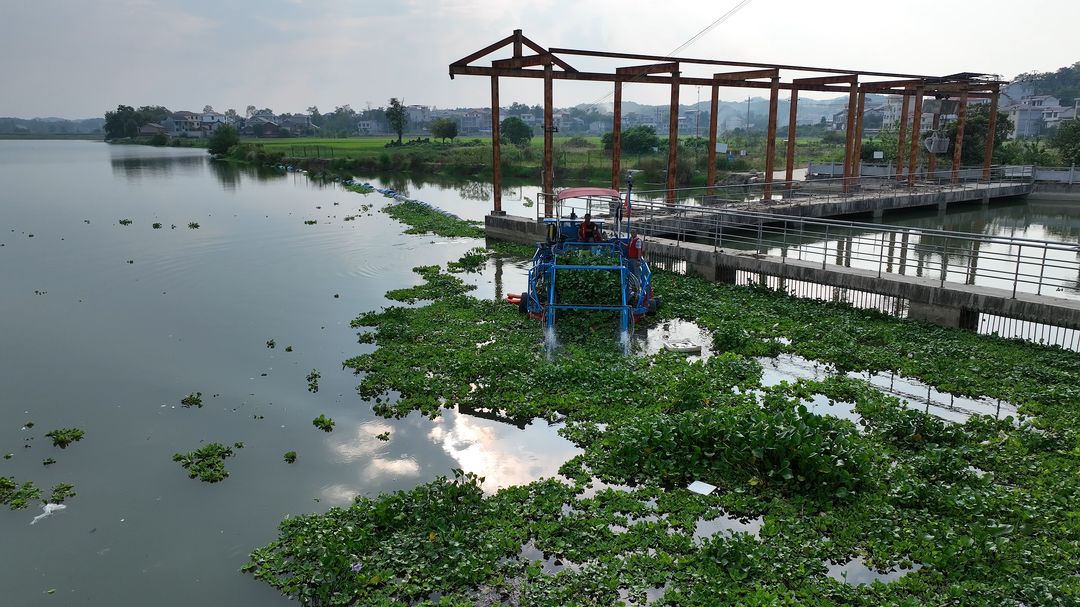 在黄桥镇田凼坝辖区疯长的水葫芦蔓延河床,工作人员以“人工+机械”相结合的方式,借助河道割草保洁船等机械化设备提升水葫芦清理效率。随着机器的轰鸣声,保洁船所过之处,连片的水葫芦被一一打散切碎,进行收集和无害化处理