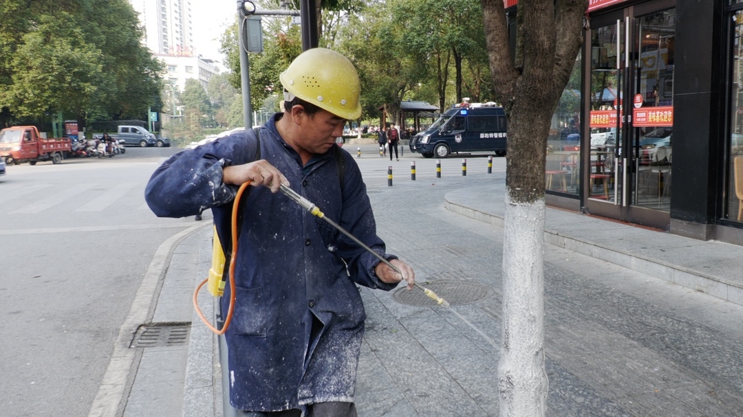 11月13日,记者在蔡锷路、砚龙路、峡口路等县城主干道看到,工人们身着醒目的工作服,背着喷雾器,利用胶带作基准线,将提前配置好的涂白剂均匀喷洒在树干上。工人们相互配合、分工合作,所过之处,高度一致、涂白均匀的树木便成为道路两侧一道亮丽的风景线。