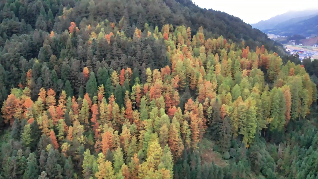从空中俯瞰,大片的水杉林在夕阳余晖的照耀下层次分明,红、黄、青交杂在一起,让人们感受到了季节交替的美妙。