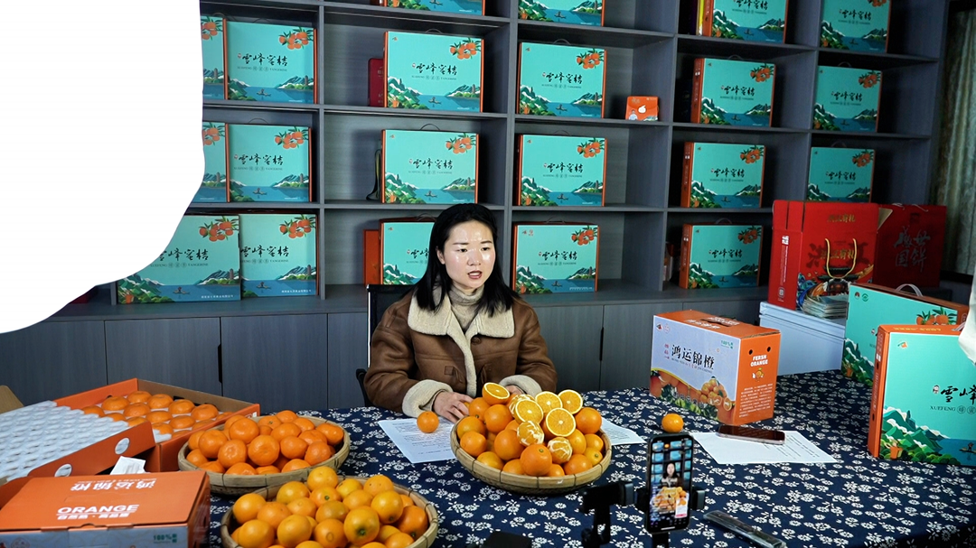 在天天观察特产礼品店,网红主播“洞口三妹”正在直播间通过手机向线上观众介绍洞口雪峰蜜桔、茶叶等农特产品,短短十分钟,直播间涌进了1000多名粉丝。