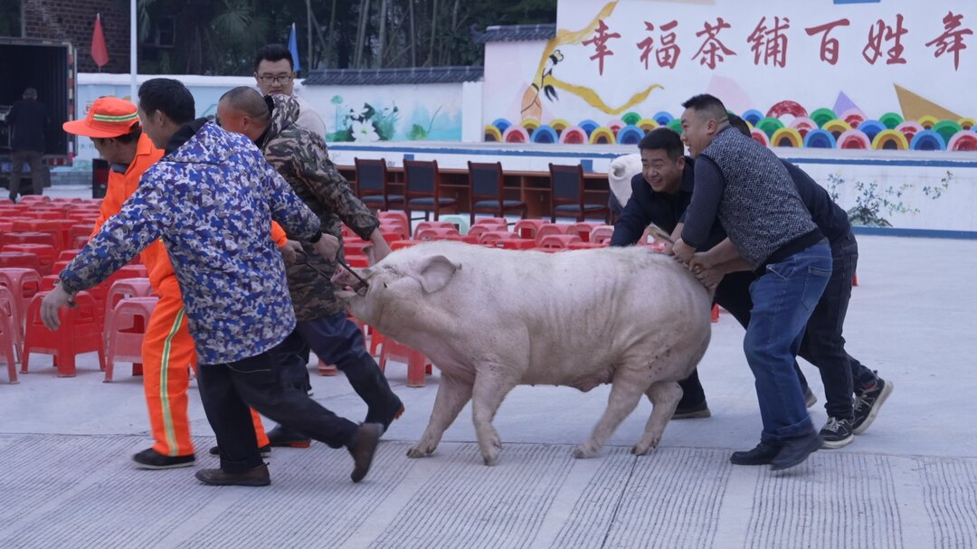 12月30日,高沙镇茶铺村村委会格外热闹,村民们早早支起了大锅、烧开了水,将土猪从猪圈里赶出来称重后,齐心协力将猪按倒宰杀,接猪血、烫猪毛、分猪肉,准备制作中午的“杀猪菜”。