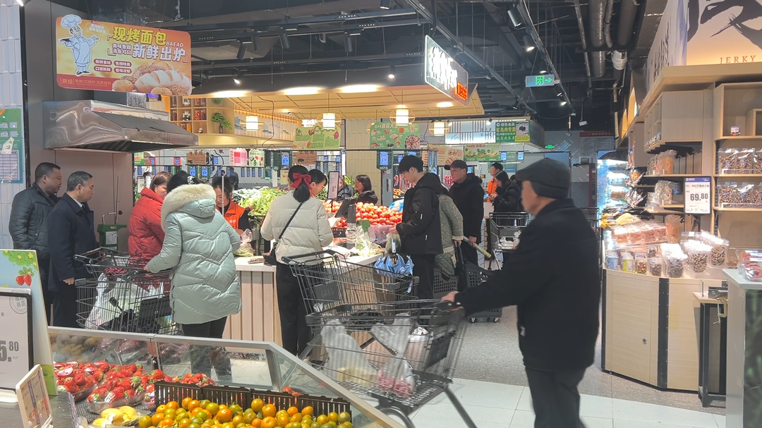 在县城喜惠泰、新家悦等大型商超,新鲜蔬菜、水果、禽肉等各类产品琳琅满目,猪肉、鱼虾等价格与往日持平,市民们正精心挑选着商品。据了解,超市根据往年的销售数据和今年的市场趋势,已在春节假期前对各类生活商品进行了及时补货,以满足市民们的购物需求。在县城农贸市场各摊位上,冬季代表性蔬菜萝卜、白菜等正大量上市,常规商品菜辣椒、花菜、黄瓜等菜供应充足、价格稳定。