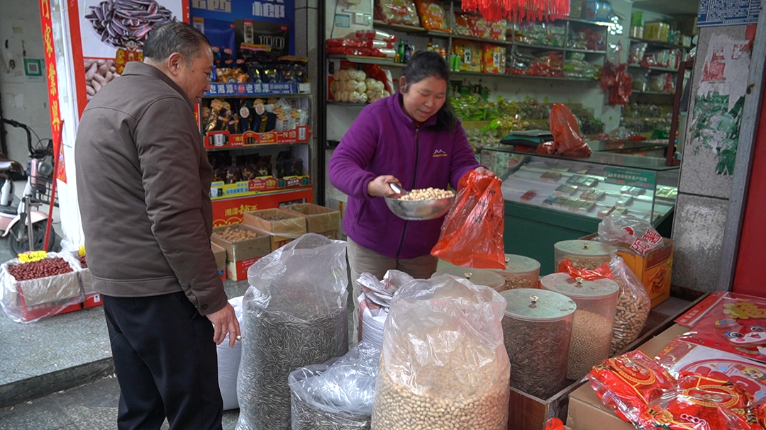 2月6日,走进县城永平炒货店,记者看到现场人声鼎沸,现炒的瓜子、花生、板栗味氤氲着浓浓烟火气,进店的顾客一个接着一个,师傅正忙着炒制新一批的花生。花生在锅炉里一圈圈翻转,师傅手中的长柄锅铲不停舞动,花生们在锅铲的拨弄下,欢快地翻滚跳跃。不一会儿,原本土黄色的外皮逐渐泛起诱人的光泽,香气也愈发浓郁。