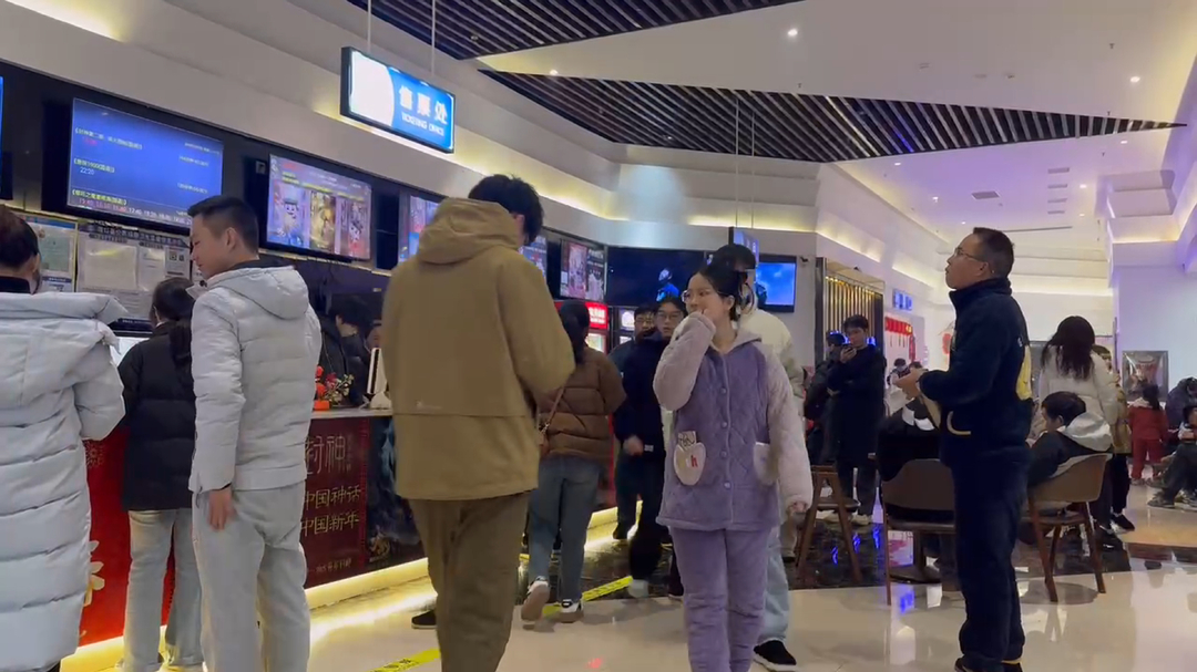 2月6日,记者在县城雪峰影城、玖和影城看到,售票大厅内满是前来买票和等待观影的人群,热闹非凡。候映厅醒目位置摆放着2025年“春节档”影片宣传海报,在前台售票处和自助取票机前,市民们正有序地排队购票、取票。影院等待区也聚集了不少候场观影的市民。