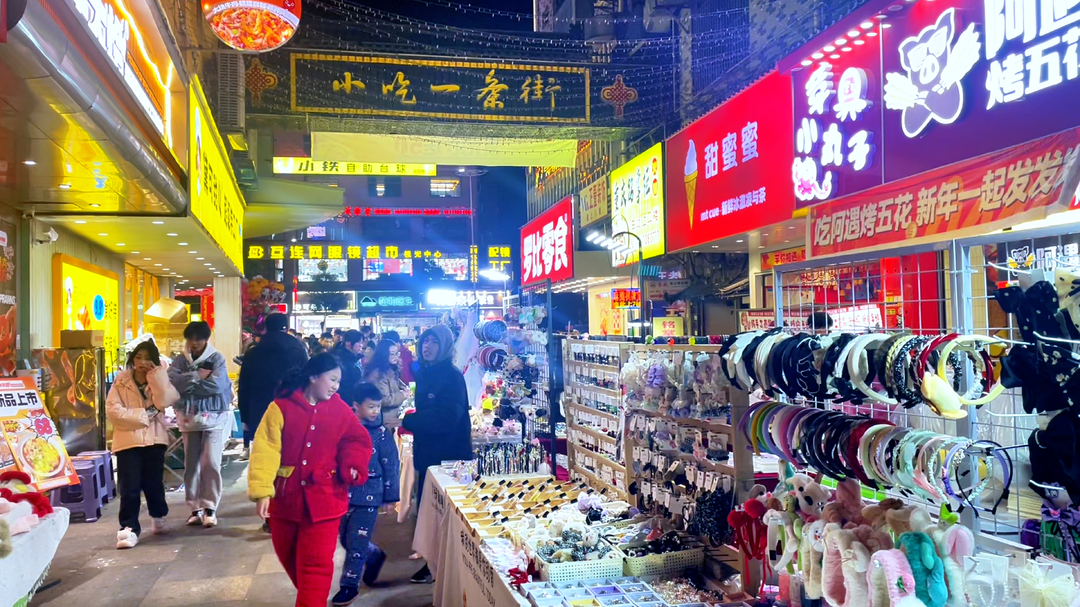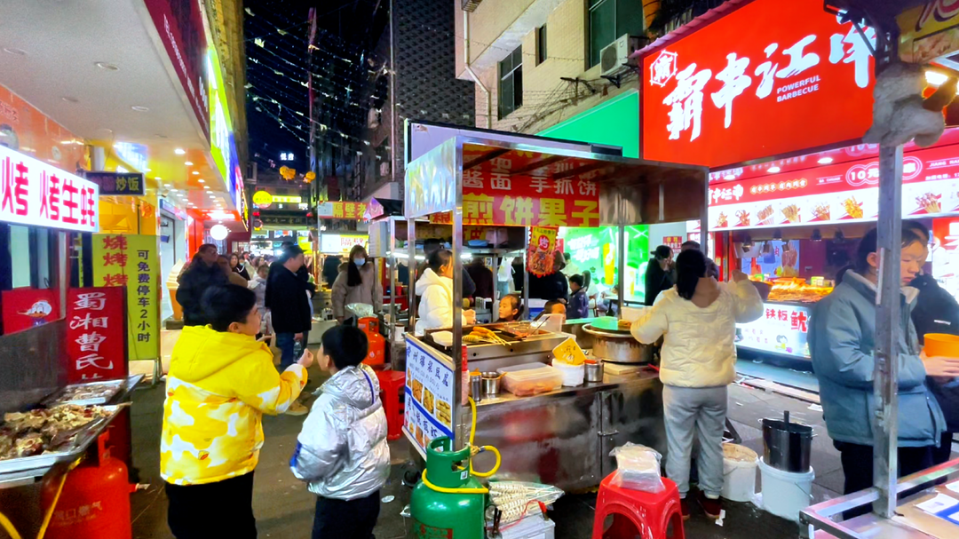 夜幕下的小吃一条街灯火璀璨、热闹非凡,琳琅满目的商品令人眼花缭乱,市民游客们穿梭在各个摊位间,感受着繁华的夜经济和浓浓的烟火气。