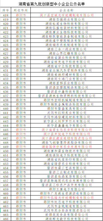 新洞口客户端2月11日讯(记者:夏晶)2月8日,湖南省工业和信息化厅发布关于湖南省第九批创新型中小企业名单的公示,洞口县宏诚光学玻璃制造有限公司、洞口尚君生态农业科技有限公司、湖南国饼世家农业发展有限公司等六家中小企业上榜。