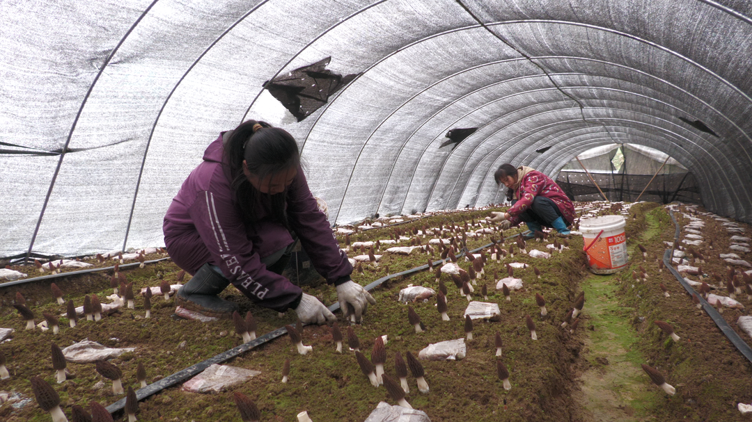 采摘工人曾柳英说:"现在采收的这批羊肚菌是我们去年11月份播种的,我们从年前就开始采摘了,每天可以摘800斤左右,通过在基地务工,我们每天还能拿到100多块钱的收入。”