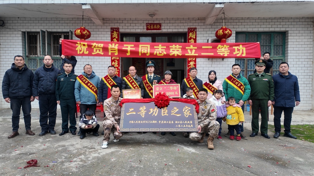 新洞口客户端2月14日讯(记者:邓贝乐 通讯员:周后明)2月14日上午,伴随着喜庆的铜锣声,县人武部、县退役军人事务局、花古街道田家村村委会相关负责人一行为荣立“二等功”的现役军人肖于及其家人送去喜报。县人武部副部长李亮参加活动。