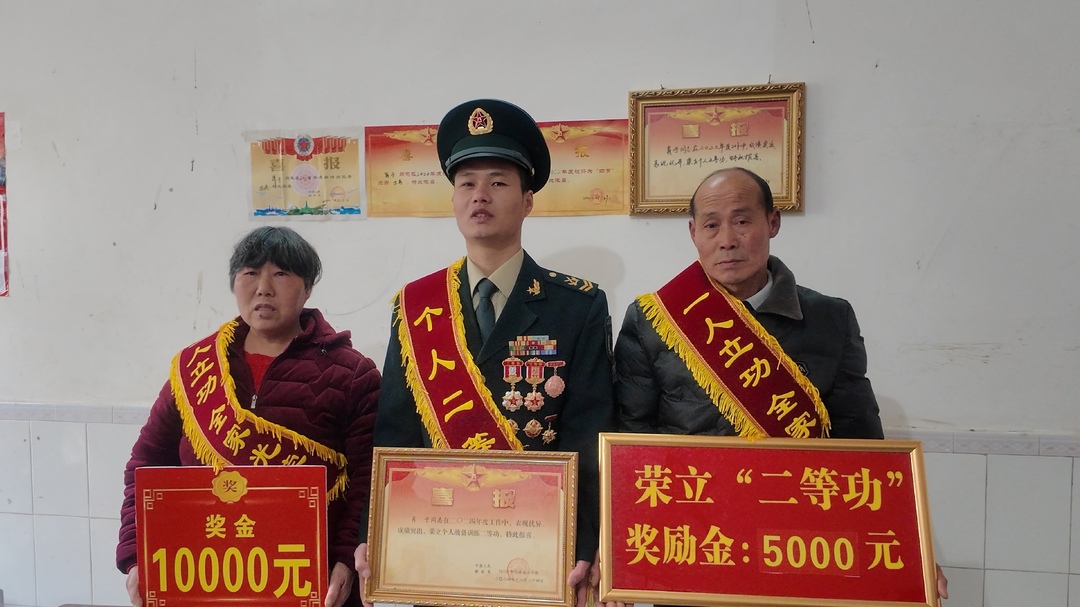在喜庆热闹的氛围中,县人武部及退役军人事务局工作人员为肖于及其家属佩戴绶带,把二等功喜报、牌匾、奖金送到他们手中。随后,慰问组一行与军属们进行亲切交谈,详细询问他们的家庭生活状况,对其在部队的优异表现给予肯定,并感谢功臣家庭为部队培养了优秀人才。