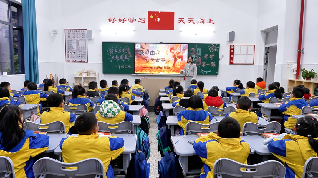 在一年级2、3班的教室里,老师用一帧帧精美的电影海报勾起了孩子们的观影记忆,再声情并茂地讲述了哪吒一路成长的感人故事,引导孩子们在新学期奋发向上,勇于突破自己。