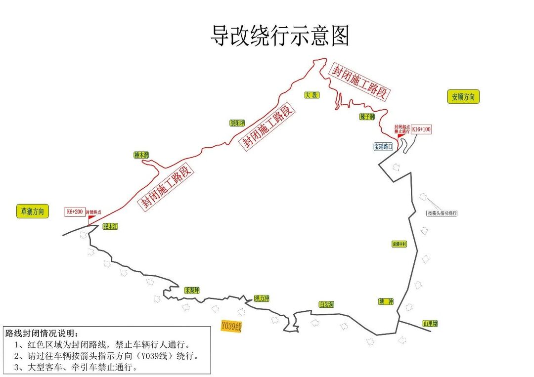 洞口交警温馨提示,施工路段24小时全封闭施工,所有车辆、行人禁止通行。往罗溪方向车辆从Y039线(罗溪国家森林公园入口处至宗溪中村卫生院旁)绕行。往草寨方向车辆可从Y039线绕行。 绕行路段禁止大型客车、牵引车、挂车、危化品运输车、校车通行。请过往车辆及周边居民合理规划出行时间和路线,自觉遵守交通管制规定,服从指挥,违者将依据国家有关法律进行处理。