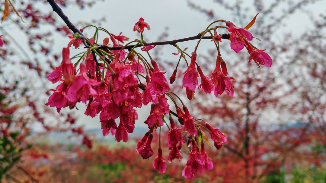 据了解,钟花樱因花貌长势像古时垂吊铜钟而得名。花期较其他品种早,通常是在3月上旬开放,3月中旬左右达到盛花期。