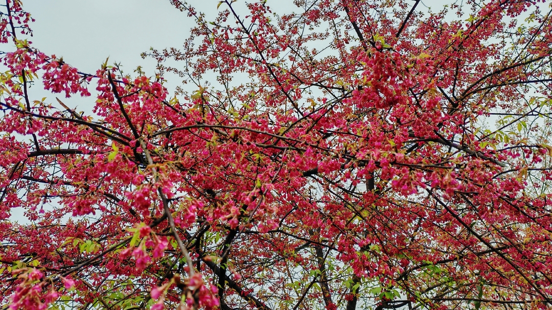 微风拂过,花朵摇曳,淡雅的花香弥漫飘散,清新怡人。花朵密密匝匝地缀满枝头,花瓣呈现出绯红色,每一片花瓣都仿佛精心雕琢,边缘略带波浪状,从远处看,整棵树就像被点燃的火焰,明艳动人。