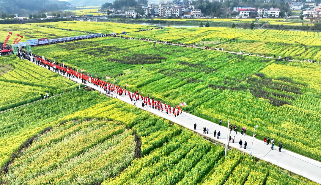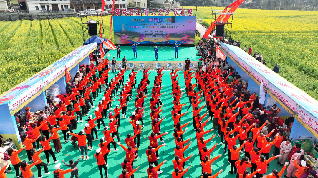 开幕式现场人潮涌动、热闹非凡。精彩的节目表演在花海轮番上演,《大鼓舞》《汉服秀》《赛马》等节目精彩纷呈,游客们在蓝天白云、金色花海间体味了一场精美绝伦的视觉盛宴。当天上午11点,100多名跑步爱好者如潮水般从油菜花海涌出,步伐轻快有力,在花田里形成一道充满活力的流动风景线。