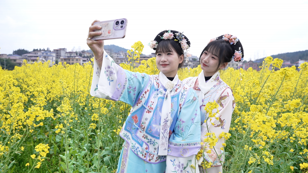 走进江潭油菜花基地,游人如织,空气中弥漫着一阵阵花香,金色的油菜花随风摇曳,好似在欢迎远方的游客前来踏青赏景。游客停下脚步,用相机、手机拍下这美丽的春色。