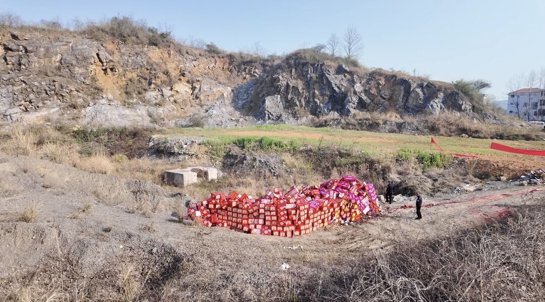 洞口融媒3月21日讯(记者 王颖蓓)3月21日,县应急管理局联合县公安局、县市监局在竹市镇一废弃采石场对近期收缴的6300件违禁违规烟花爆竹进行集中统一销毁。