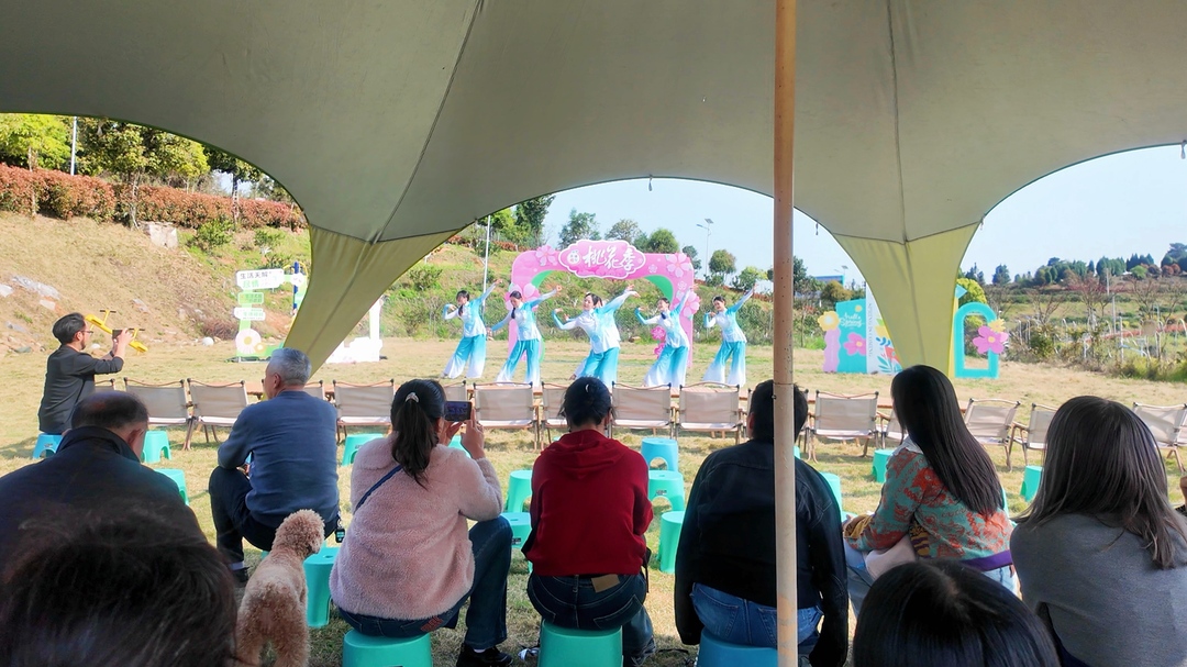 在茶铺桔院,演出现场围满了男女老幼,数百名群众津津有味地围观欣赏。文艺演出在歌曲演唱《桃花朵朵开》中拉开序幕。随后,歌曲演唱《节日欢歌》、《美猴王》等节目轮番上演,舞蹈《上春山》、《啦啦操》等表演更是把演出推上了高潮。演员们精彩的表演,赢得了现场观众的阵阵掌声与喝彩。