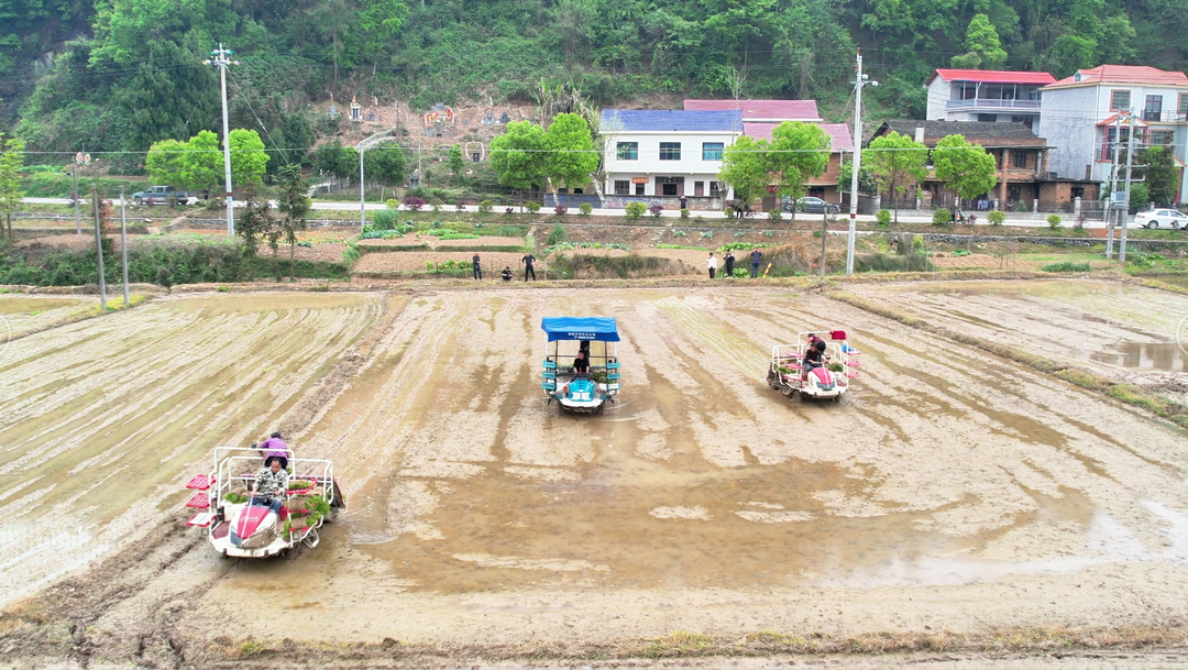 田垄上,插秧机正在进行自动化早稻插秧作业,一颗颗秧苗被有序地种到水田中,扎根于“希望的田野”上,满满“科技范”生产画卷跃然眼前。