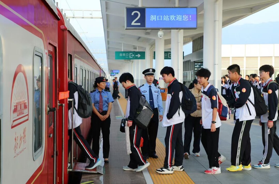 早上6时30分,研学师生陆续抵达洞口站。为保障师生有序候车、上车,洞口站工作人员与车站民警增派力量,对候车室进行安全检查,督促安检岗位做好实名验证和安检查危工作,加大候车室巡逻力度,全方位做好保障工作。同时,为研学团队开辟绿色通道,在进站口、检票口、站台等关键位置做好引导和帮扶工作,让广大师生出行更便捷舒适。