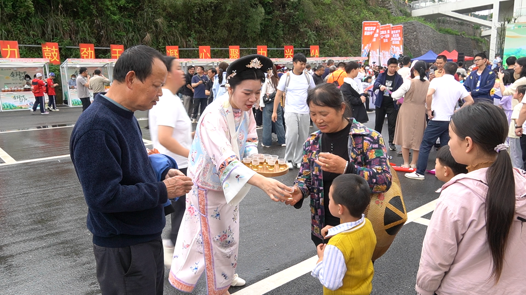 市集现场热闹非凡,20余个摊位错落有致,各类茶叶、农产品琳琅满目,令人目不暇接。为强化消费体验,市集设置免费品鉴区,现场冲泡当季新茶试饮。现场人头攒动,游客们纷纷驻足品尝,茶汤清冽、香气馥郁,一杯杯洞口雪峰茶将独特魅力转化为直观味觉体验,带动消费热潮。茶香未散,辣酱、蜂蜜、农家土鸡蛋等洞口县的特色农产品也成了“抢手货”,还有猪血丸子、手作腊肉等“土味”齐齐亮相,游客们品尝着这些地道的“土特产”,脸上洋溢着满足的笑容。
