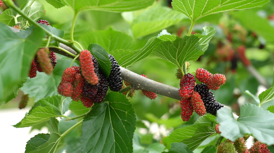 桑葚不仅美味,还富含维生素、矿物质等营养成分,具有补肝益肾、生津润燥、乌发明目等功效,是春季不可多得的保健佳果。该农场种植的桑葚为“无籽大十”品种,具有果实无籽、味甜多汁等特点。采摘期从4月底持续到5月中旬。
