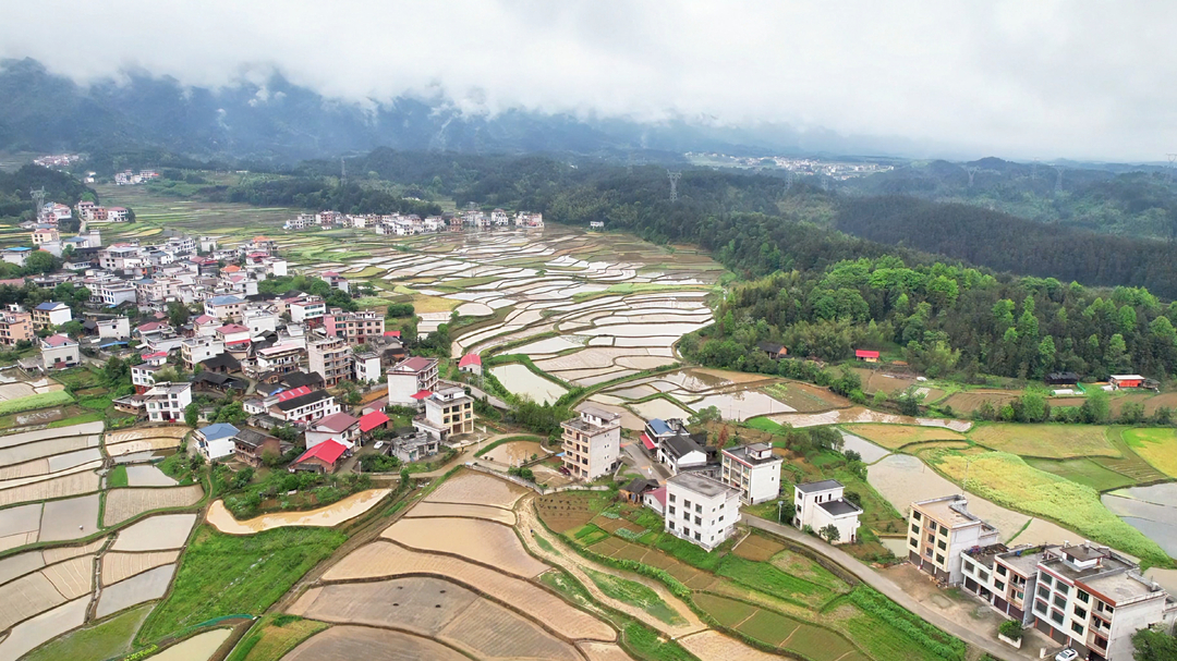 4月29日,记者来到平栋村,只见成片的梯田蓄满春雨,雪峰山脉云雾缭绕,飘逸的云海层叠相拥,似流动的水墨画卷,青葱山林环抱,田间水光澄净,山塘宛如玉盘镶嵌其中,民居依山而建,美不胜收。