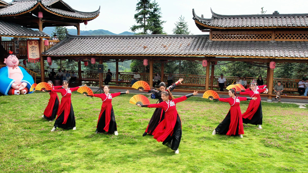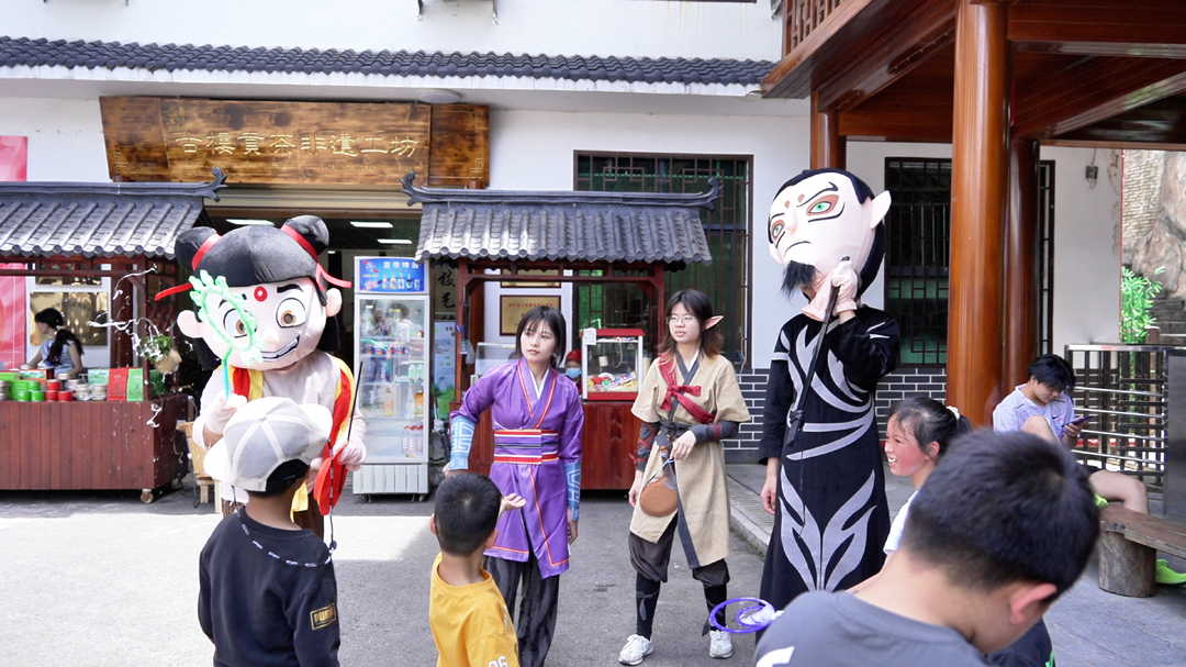 洞口县古楼驿生态文化旅游区将传统民俗与新潮艺术相结合,推出哪吒巡游茶园、国风打卡、红色旅游等活动,景区内数十名盛装打扮的哪吒、敖丙、太乙真人、申公豹在景区内与游客进行精彩互动。