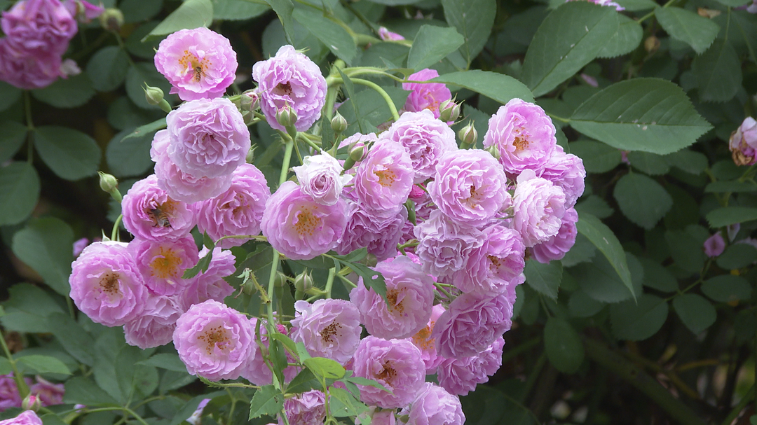 微风吹拂,繁茂的月季花如同波浪般起伏,紫红、粉红,各色花朵交织成一幅流动的油画,仿佛是打翻了莫奈的调色盘,将斑斓的色彩倾泻人间,蜂蝶也在丛中起舞翩飞,互相嬉闹。凑近细嗅,还有一股淡淡的花香,沁人心脾。