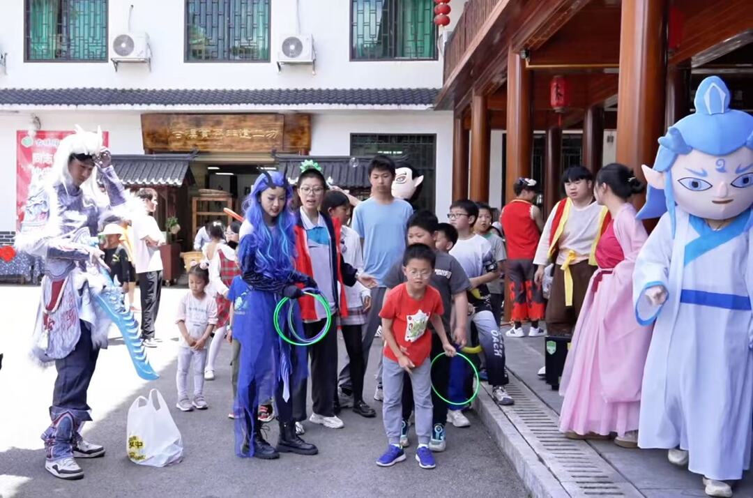 洞口县古楼驿生态文化旅游区将传统民俗与新潮艺术相结合,推出哪吒巡游茶园、国风打卡、红色旅游等活动,景区内数十名盛装打扮的哪吒、敖丙、太乙真人、申公豹在景区内与游客进行精彩互动。