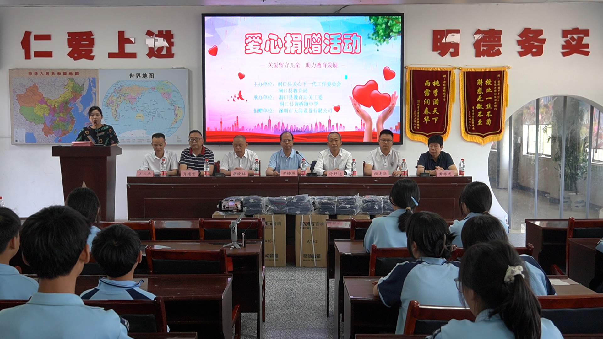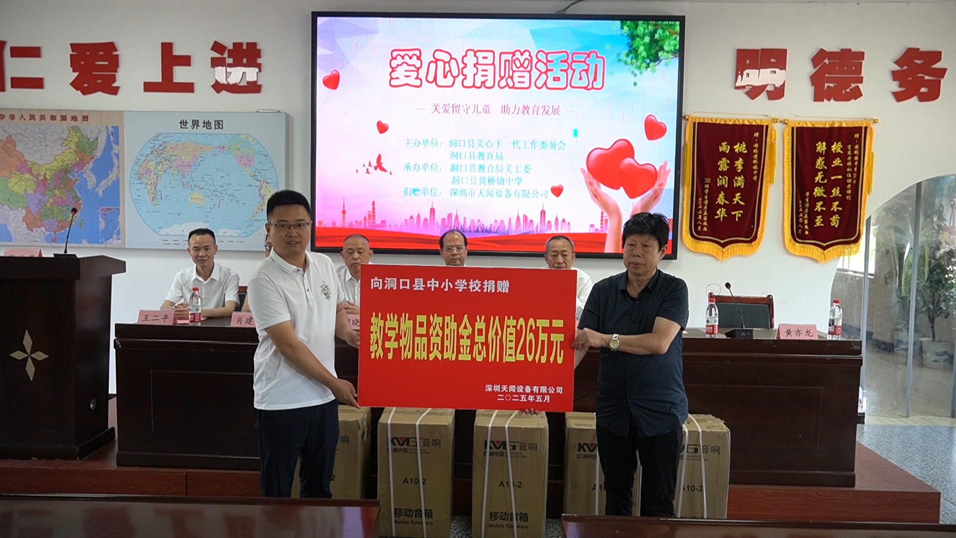 洞口融媒5月12日讯(记者:江京晟 通讯员:黄亦龙)5月12日,洞口县关心下一代工作委员会、县教育局联合深圳天闻设备有限公司在黄桥镇中学开展“关爱留守儿童 助力教育发展”捐赠活动,捐赠价值26万元的教学物资与助学金,为优秀贫困学生点亮求学希望。
