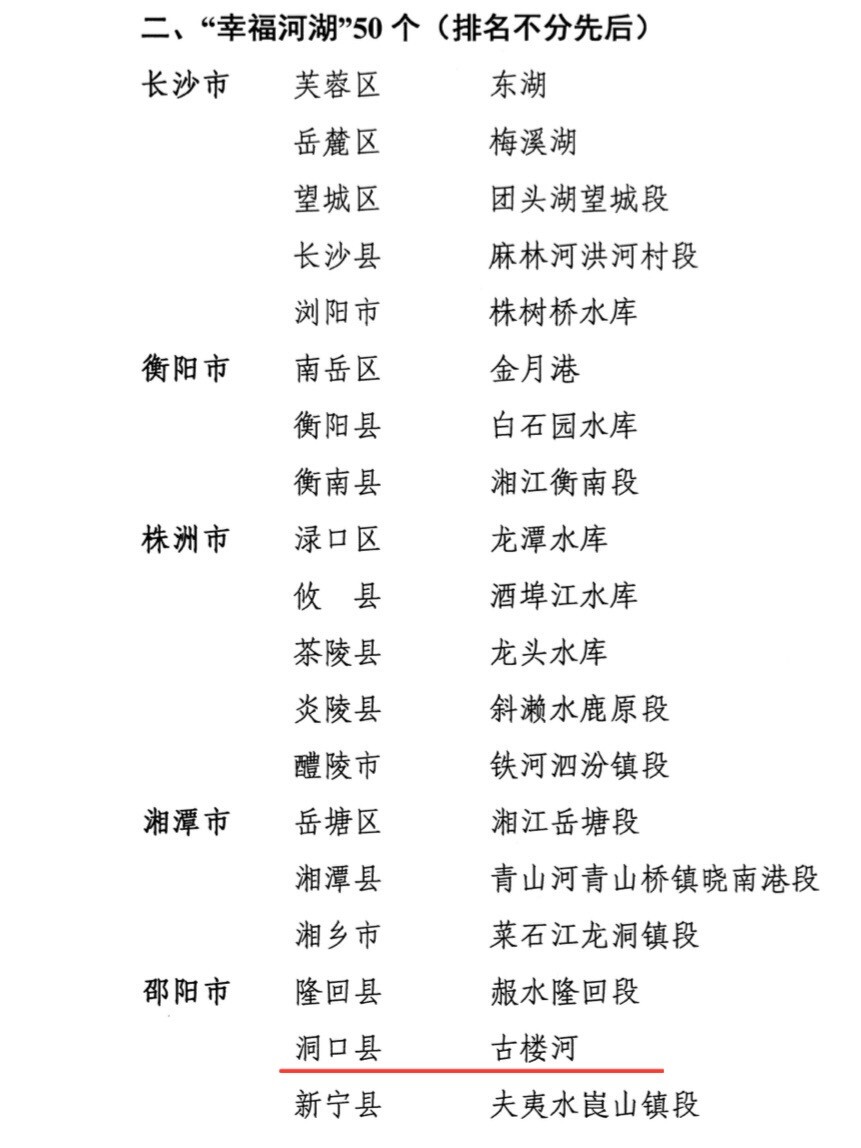 洞口融媒5月13日讯(记者:欧阳沐娟 通讯员:龙辉)近日,省河长办公示了2024年度湖南省50个“幸福河湖”评选结果,我县古楼河上榜。