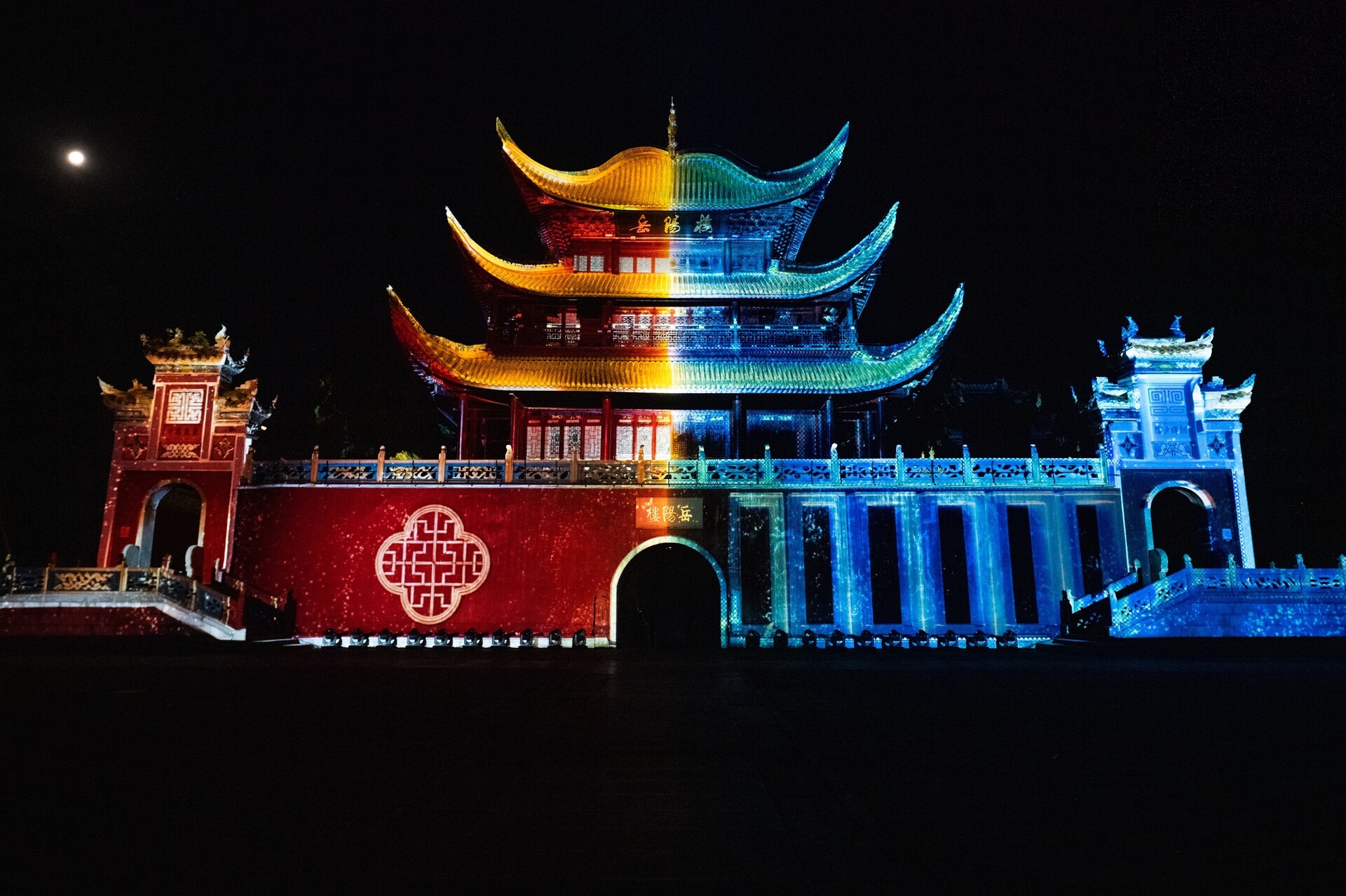 夜幕降临,岳阳楼景区光影点亮,表演拉开帷幕,穿越千年的文化之旅正式开启。