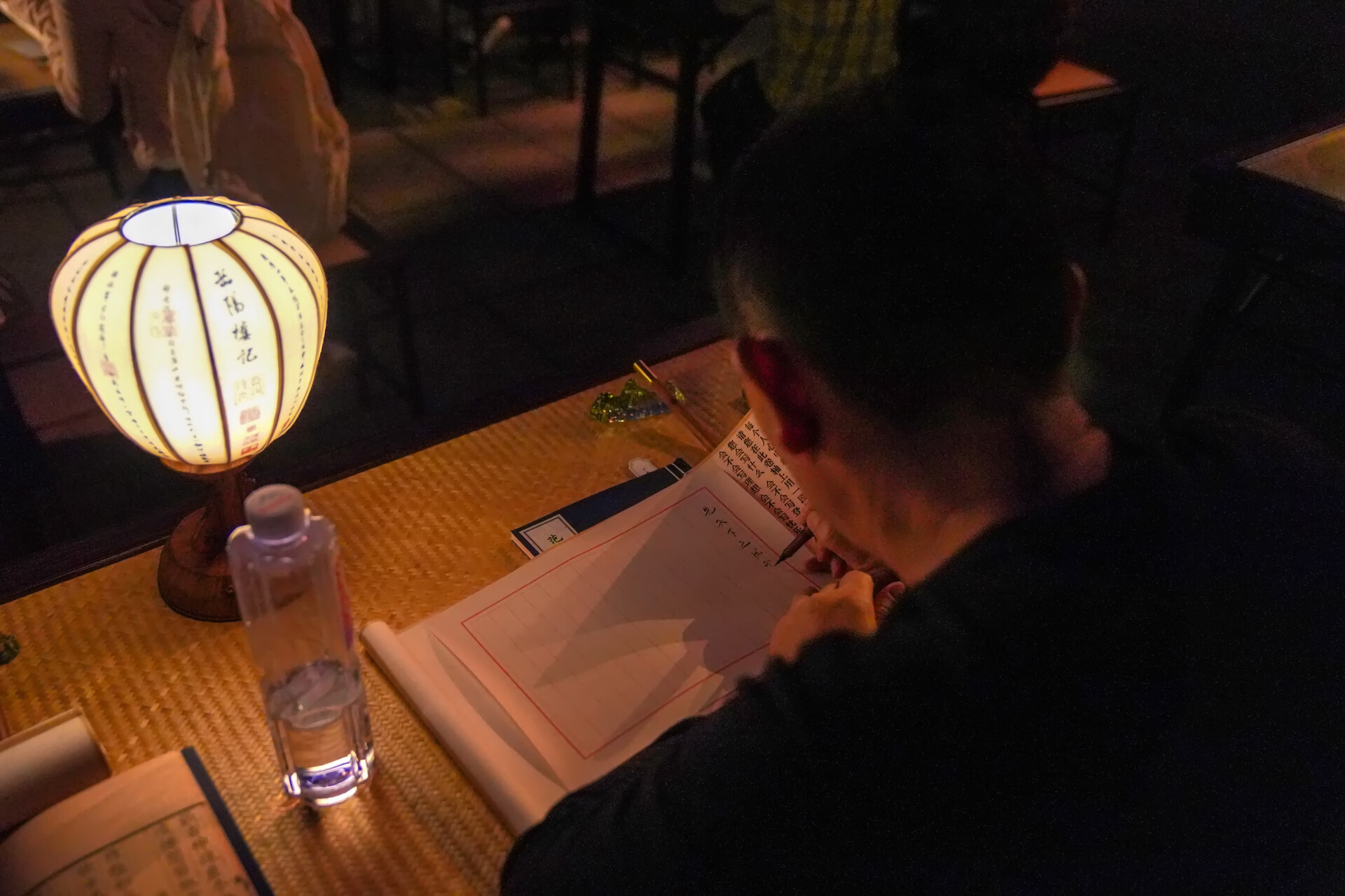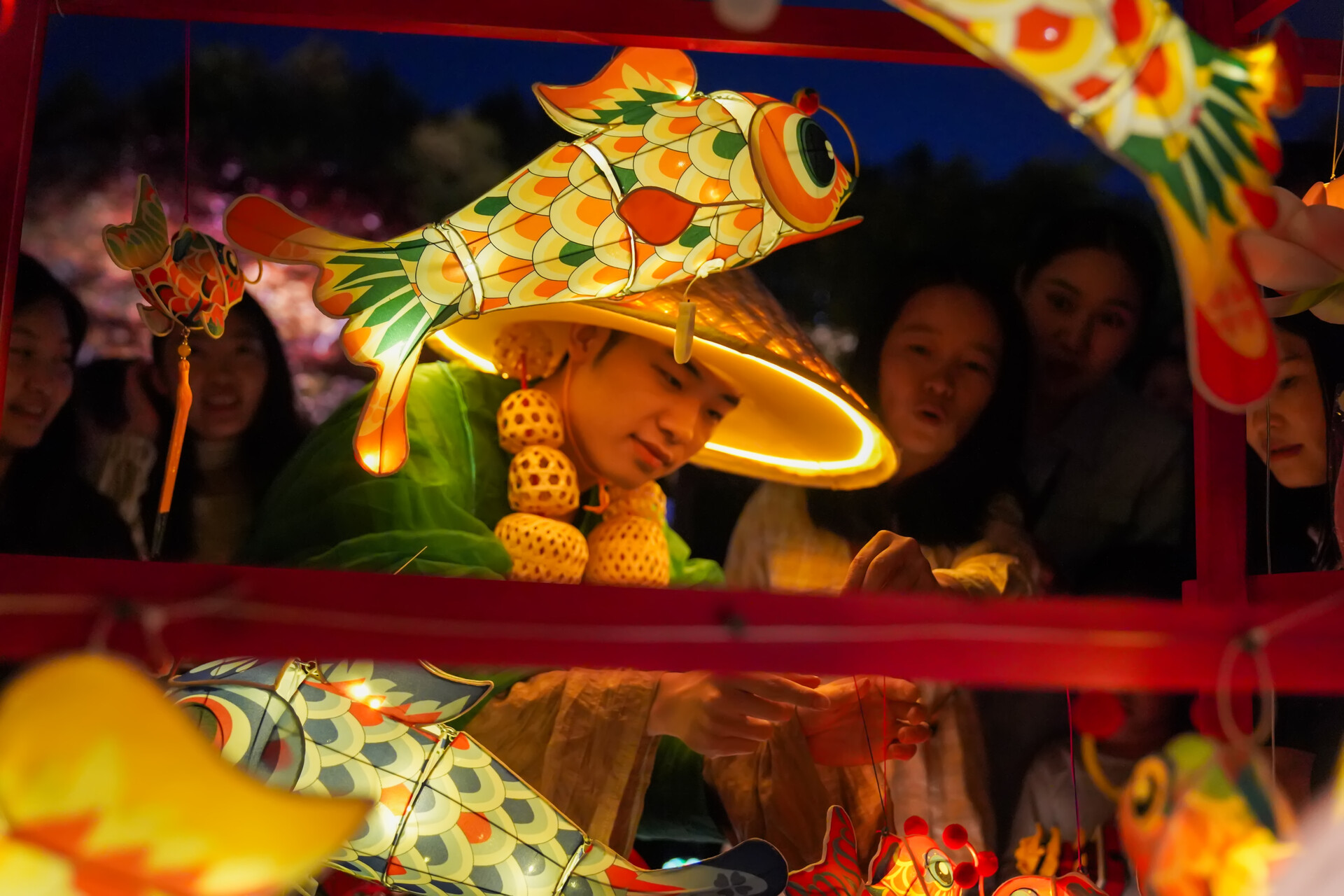 南门“读者”剧场结束后,媒体代表们在演员们的引导下起身提灯,行径向前,穿越五朝楼观处热闹的集市,沿途的小贩们吆喝不断,卖花卖甜酒卖灯笼,仿佛瞬间穿越到庆历年间的巴陵。