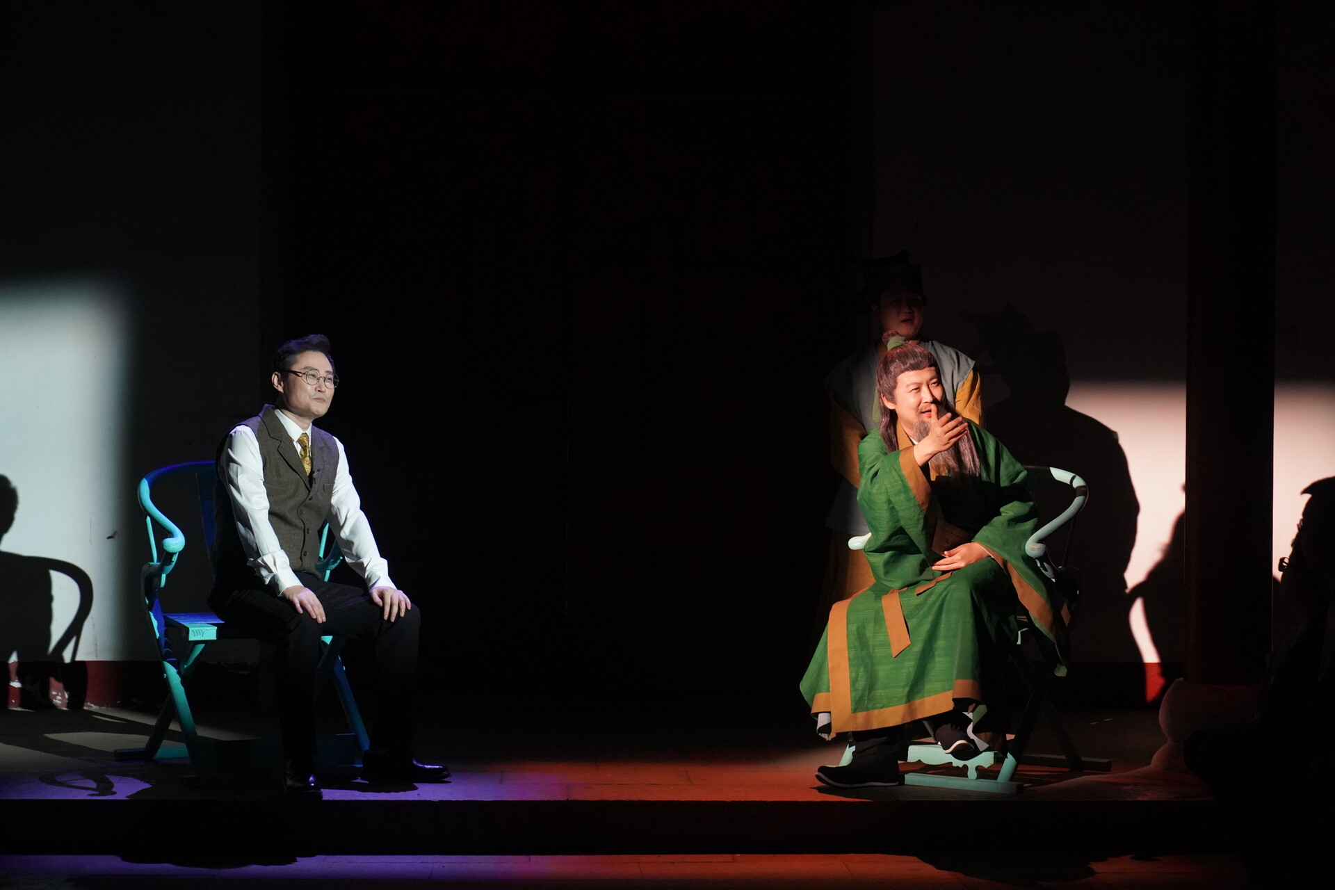 进入双公祠的“两地求记”剧场。来自省话剧院的知名话剧演员王峰倾情演绎来自现代的读书人,与来自北宋滕子京开启古今对话,戏剧化地还原了滕子京重修岳阳楼后,力邀范仲淹撰写《岳阳楼记》的背后故事。