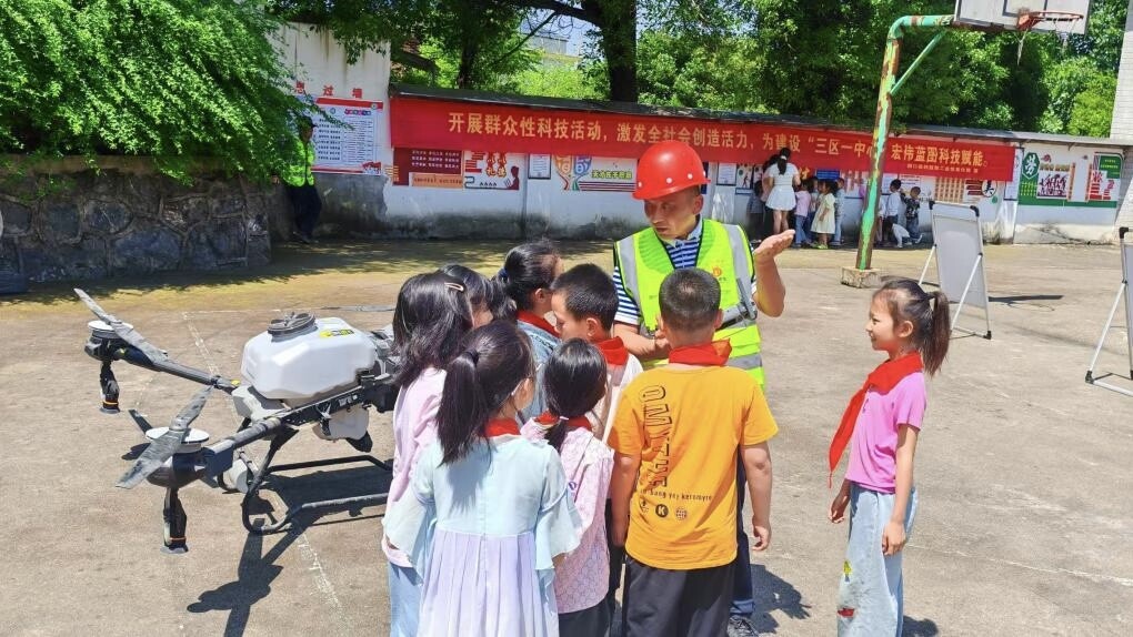 随后,学生们观看了展示农业科技、工业创新等领域成果的展板横幅,科普老师进行现场讲解,为学生们带来了一场“干货满满”的科普小课堂,让学生亲身体验科技魅力,培养科学素养。县恒大农业开发公司无人机操作手现场演示,向学生展示了无人机用于农业播种、植防、灌溉的使用,更直观展现科技应用,引发阵阵惊叹。