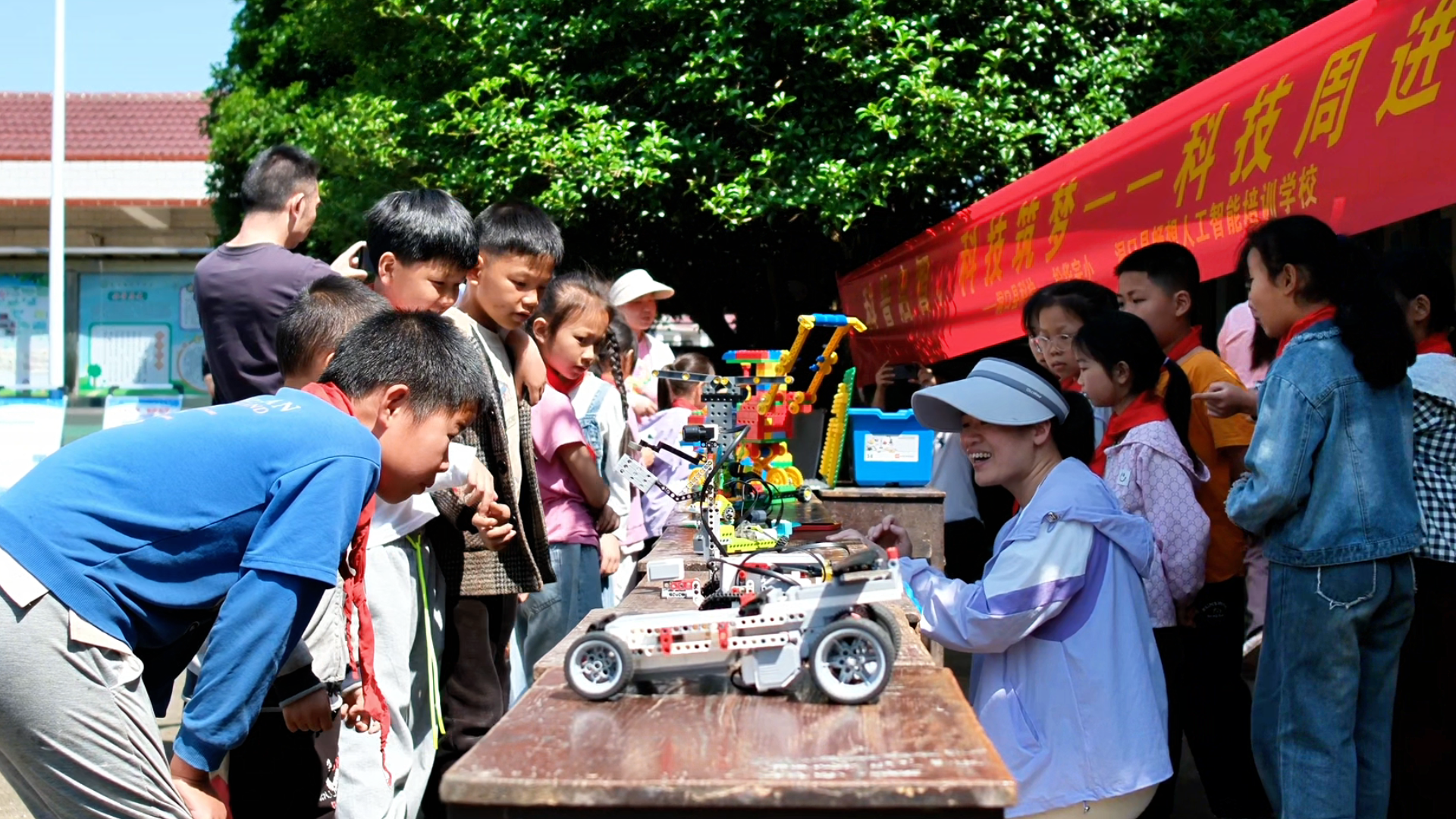 活动现场,县科工局工作人员向学生们赠送“十大华人科学家丛书”科学家故事书籍,松华小学校长曾辰辉和机器人培训学校科技老师同步讲解答疑,传递科学精神。大型机器人的亮相,吸引众多学生驻足观看、近距离接触。