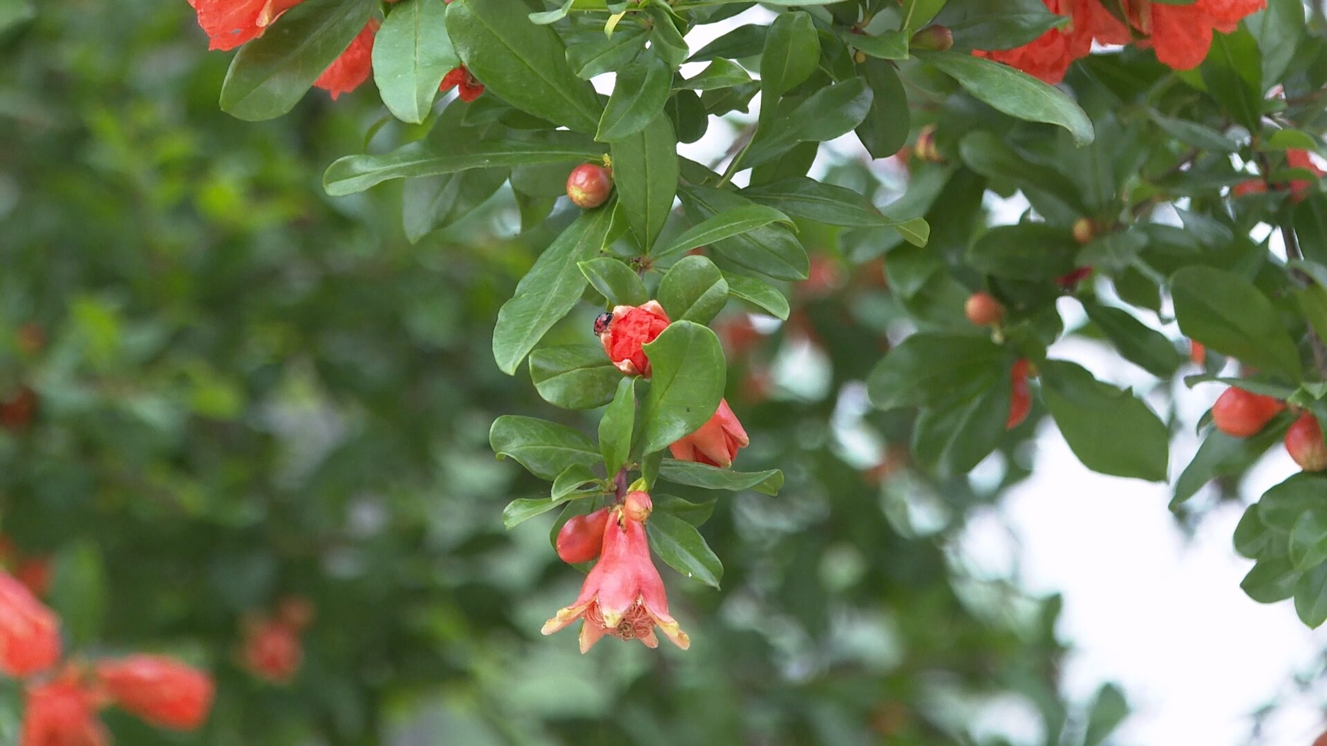 据了解,石榴花为两性花,分顶花和腋花,花序呈伞房状,中心花先开、侧花后开,每个花序通常有1-9个花蕾。花萼呈红色或淡黄色,裂片略外展;花瓣颜色多样,分单瓣和重瓣,瓣质薄且有皱褶,花期可持续至7月。