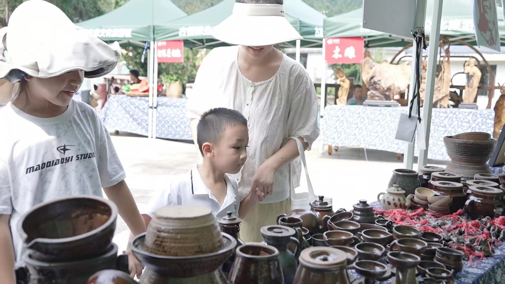 步入景区,游客不仅可以欣赏剪纸艺人的巧手翻飞,看红纸在指尖变幻出吉祥纹样;还能在陶瓷展区近距离触摸土陶的温润肌理,感受从泥土到成器的匠心历程。在绘染展示区,一幅幅以山水、花鸟为题的染布悬挂陈列,非遗传承人从颜料取材、图案寓意到工艺流程,细致讲解这门古老艺术背后的文化密码。茶艺体验区则氤氲着古楼贡茶的清香,不少游客品尝古楼贡茶后,于茶汤的醇厚回甘中,体会时间沉淀的味觉艺术。