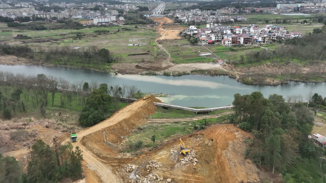 2月21日,洞口四桥(平溪江大桥)及接线工程建设工地上机械轰鸣,工人们在自己的岗位上紧张忙碌,有条不紊地合力推进项目建设。