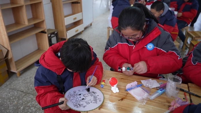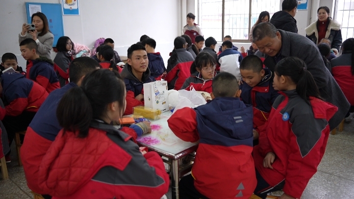 新洞口客户端3月14日讯(记者:王周鹏 通讯员:冯娜 张芳)3月14日,洞口思源实验学校组织60余名师生志愿者开展“传递爱心 情暖特教”主题活动,为县特殊教育学校的学生们送上零食、书本等小礼物,与他们一起做手工,锻炼他们的动手能力。
