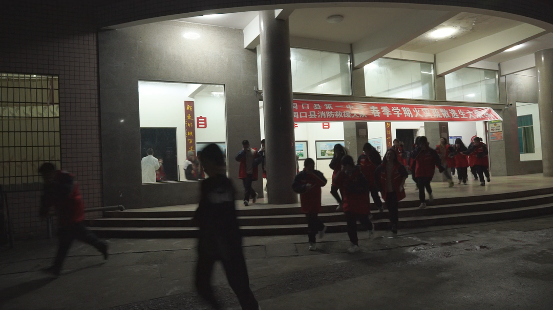 演练模拟洞口一中北校区学生宿舍楼突发火灾,随着警报声响起,同学们在老师引导下,弯着腰,用衣领、湿毛巾等捂住口鼻,分楼层,分方向,按既定路线经过安全出口有序疏散到操场指定位置,各班班主任、寝室长整理队伍检查男女生人数,学生疏散完毕后,消防员立即开展灭火,整个演练过程紧张有序。