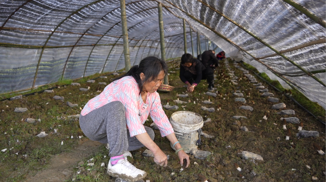 在羊肚菌种植棚里,一朵朵鲜嫩的羊肚菌错落有致地盛开在菌垄上,像一把把撑开的褐色“小伞”,丰盈饱满,惹人喜爱。邓志健率村民们将采下的羊肚菌运送到加工车间进行分拣、摆放装盘,再经过烘干后冷藏,以保证羊肚菌的品质和口感,同时更好地满足线上订单需求,打包发发往全国各地。