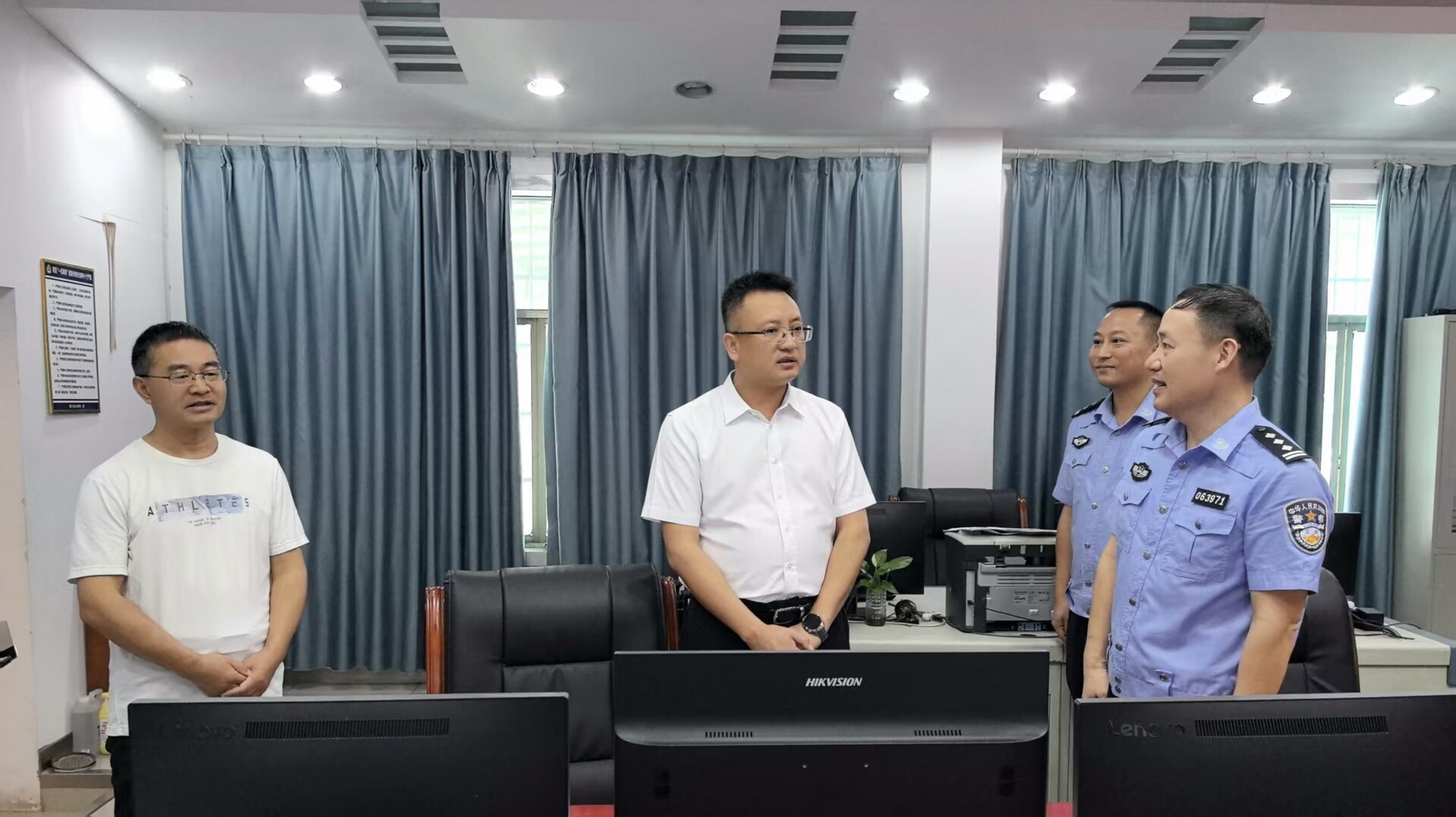 在县公安局交警大队指挥中心,许治国通过智能监控大屏实时查看辖区道路通行状况,听取交警部门关于“两节”期间交通流量、事故预防及应急处置等工作汇报。